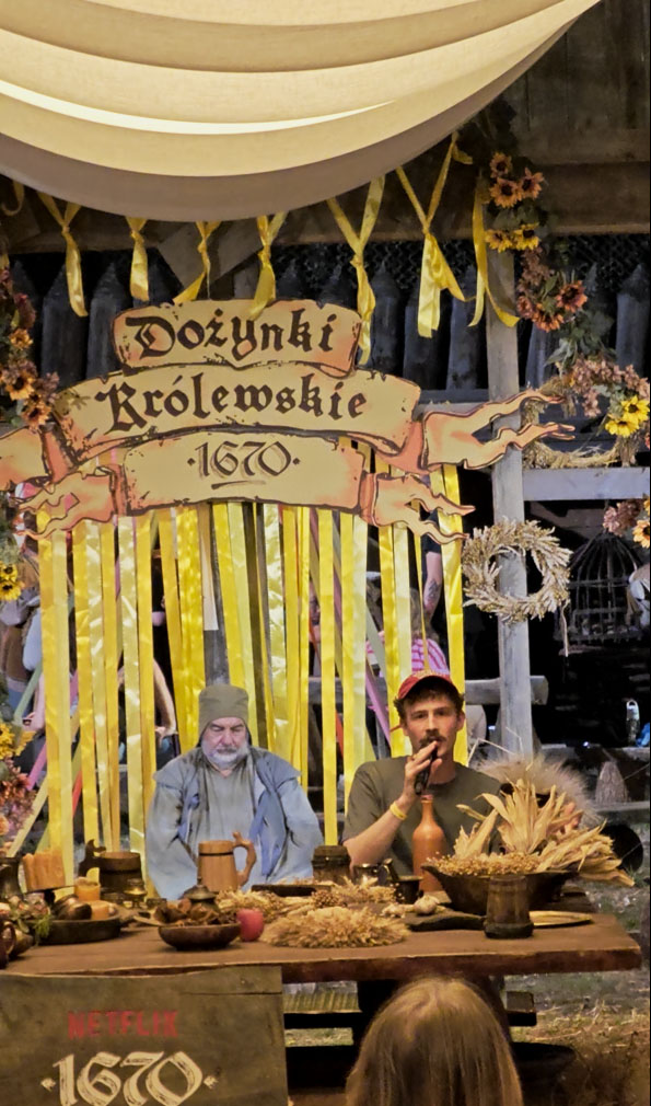 „Dożynki Królewskie 1670” były pomyślane jako festyn-immersja — wciągnięcie widza w realia świata serialu, z humorem i stylistyczną przesadą, ale w oparciu o czytelny, rodzinny format. W strefie funkcjonowały „aktywacje”, czyli stanowiska i mini-atrakcje powiązane z wątkami i estetyką „1670”. Organizator przewidział zasady dla każdej aktywacji (instrukcje i ewentualne regulaminy cząstkowe dostępne na miejscu), możliwość kolekcjonowania pamiątkowych wydruków z fotobudki oraz elementy „żywej scenografii”: wejścia stylizowane, rekwizyty, a także gastronomiczne echa świata przedstawionego. W relacjach mediów i gości przewijały się sarmackie powitania, „karczma u Żyda” jako motyw kulinarnej zabawy, ceremonialny chleb (i „zakazana sól”) oraz kostiumowy entourage aktorów i statystów. Całość spinał ton pastiszu znany z serialu: swojska pompa, dystans i mrugnięcia okiem do memetyki „szlachta nie pracuje”.